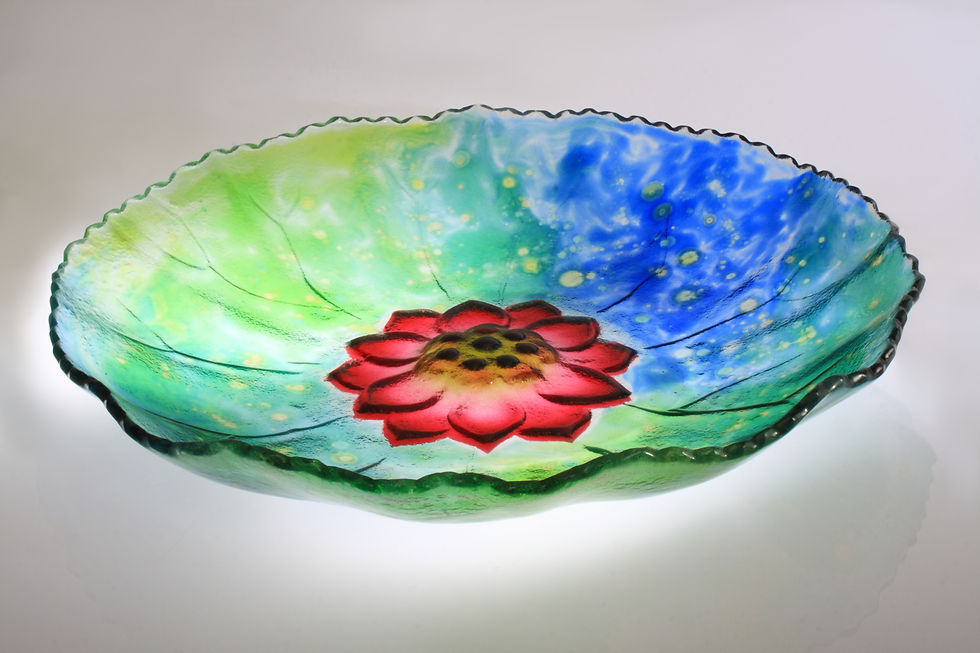 窯燒後的玻璃表面,色彩的渲染力強,搭配玻璃浮雕、融合等技法呈現立體質感。